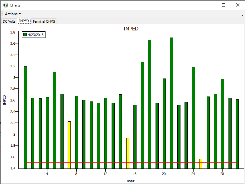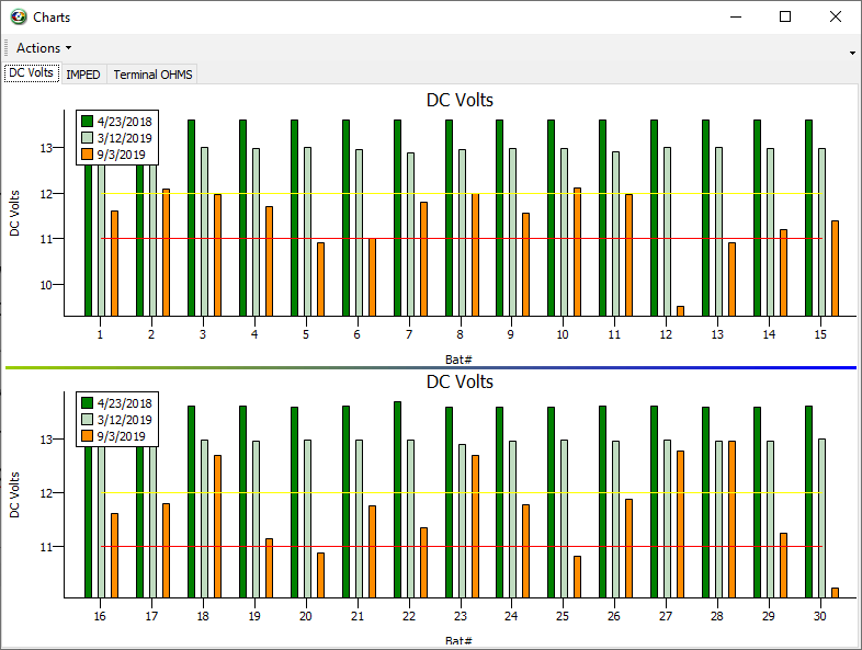 The charts can be of the current state of the batteries or be shown as a “trending” to further visualize the degradation over time of each individual battery which can help demonstrate the sense of urgency to replace failing batteries.